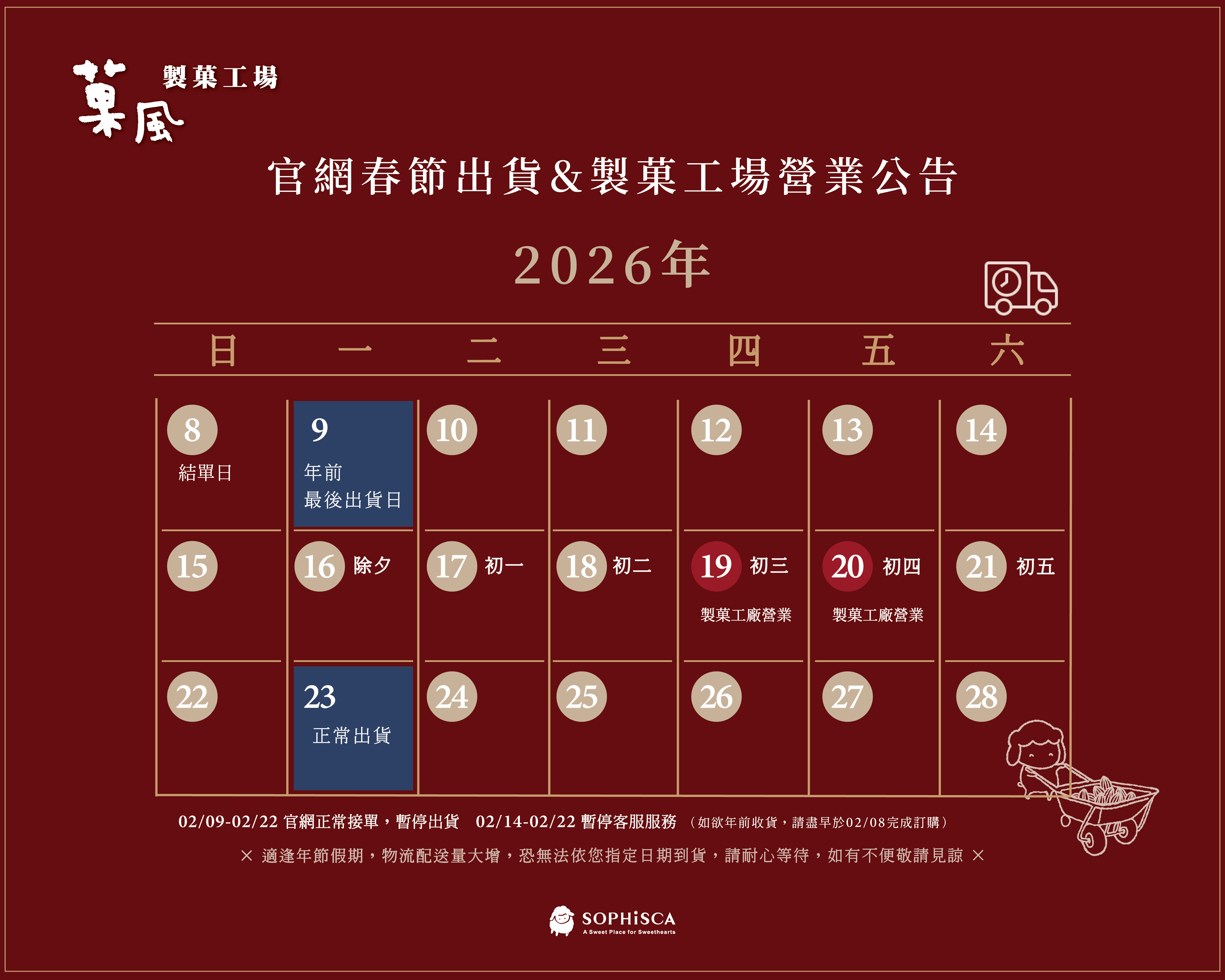 - 02/09 (一) 成立的訂單,將延至02/23 (一) 陸續出貨