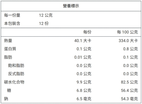 主要成份:麥芽糖、砂糖、草莓濃縮果汁、甘油、海藻糖、D-山梨醇液70%(甜味劑)、鹿角菜膠、大豆蛋白、果膠、檸檬酸、檸檬酸鈉、香料