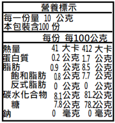成份:砂糖、麥芽糖、全脂奶粉、完全氫化棕櫚仁油、明膠、牛奶膏、脂肪酸甘油酯、甘油、大豆卵磷脂、檸檬酸、麥芽糊精、香料、焦糖色素