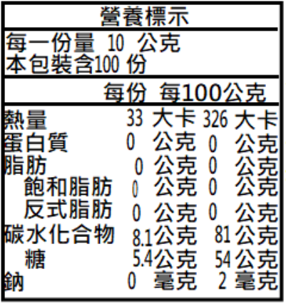 主要成份:麥芽糖、砂糖、濃縮果汁 (百香果、紅心芭樂、金桔檸檬)、檸檬汁、D-山梨醇液70% (甜味劑)、鹿角菜膠、果膠、檸檬酸、檸檬酸鈉、糯米紙粉